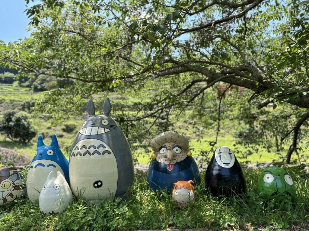 また、少し車で山を登ると、ジブリのキャラクターたちが並んでいるスポットがあります。知る人ぞ知る場所です。