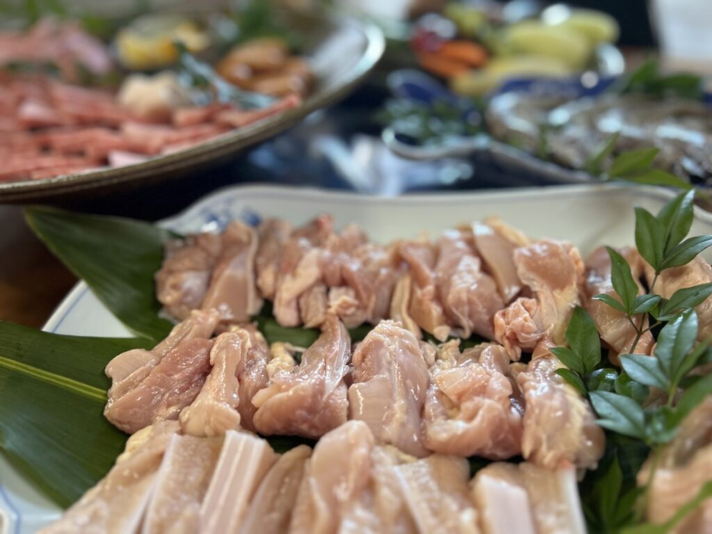 大人おひとり様の内容:伊万里牛上モモ50g 赤身150g、ありた鳥のモモ肉50g、せせり50g、やげん軟骨50g 、チキンバー50g、季節の焼き野菜、自家産米ごはん、お漬物、その他